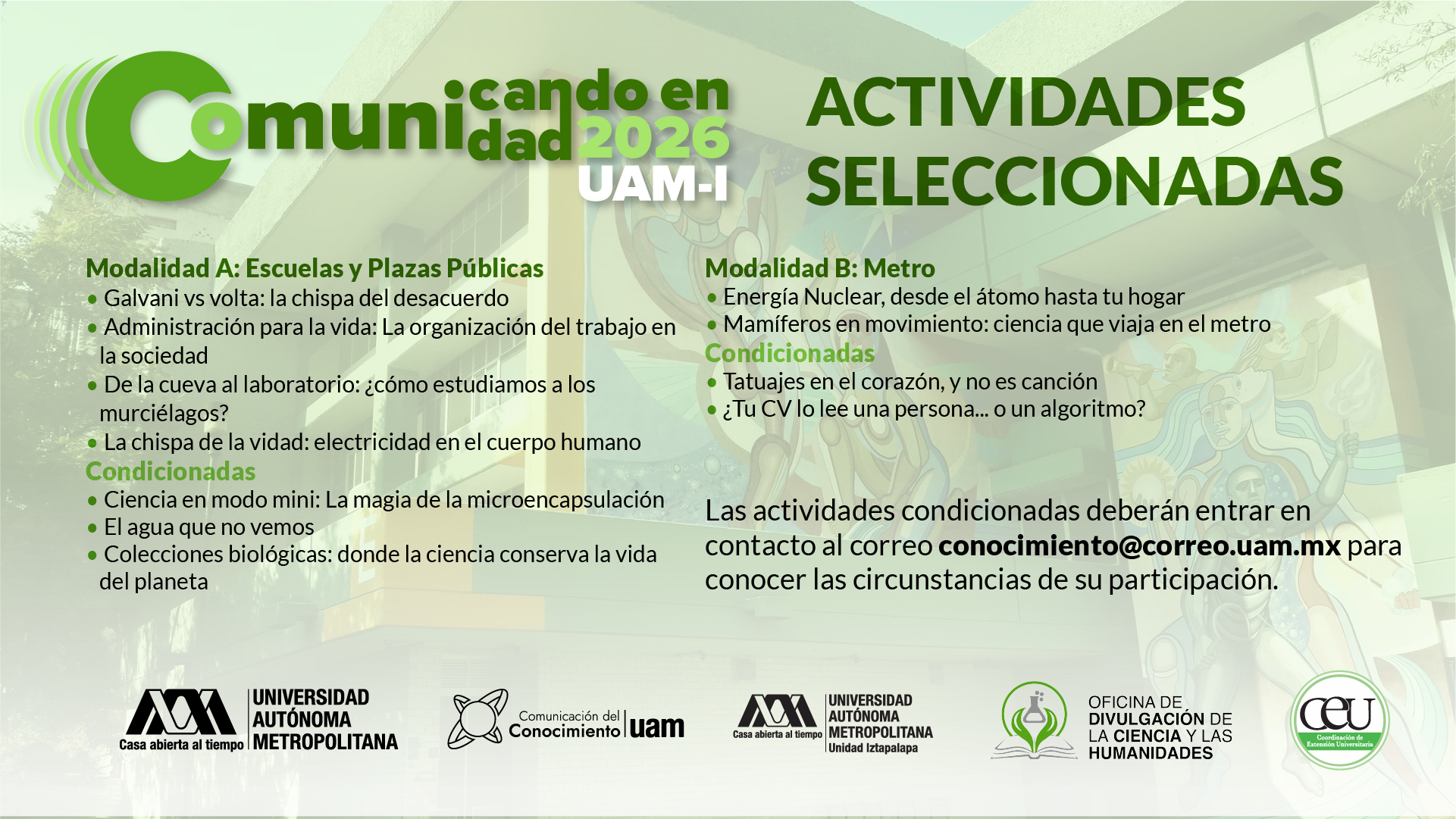 La Dirección de Comunicación del Conocimiento (DCC) de la Coordinación General Académica de la Rectoría General, en conjunto con la Coordinación de Extensión Universitaria de la Unidad Iztapalapa, convocan al profesorado de esta Unidad Universitaria a diseñar y presentar actividades divulgativas en ciencias, humanidades e ingenierías para incidir en escuelas, plazas públicas, así como en la Estación Constitución de 1917 de la línea 8 del Sistema de Transporte Colectivo (STC) Metro.